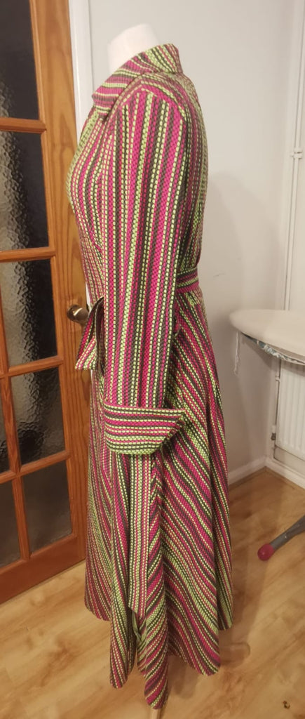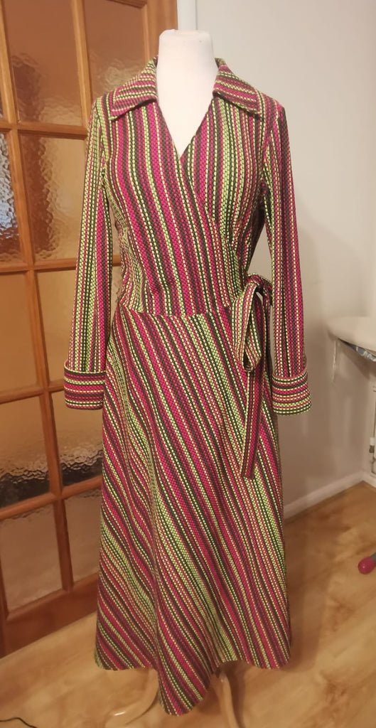 This classic striped Shelly Dress is a 70's-inspired midi wrap dress with unique cuff details that offer a versatile and stylish option for various occasions. The wrap style is flattering for most body types and the midi length provides a sophisticated look. The striped pattern adds a timeless touch while the 70's inspiration brings a hint of retro charm. The unique cuff details can add a modern twist to the overall design, making it a standout piece in your wardrobe.