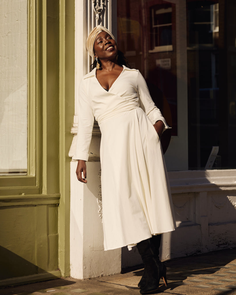 This classic White Shelly Dress is a 70's-inspired midi wrap dress with unique cuff details that offer a versatile and stylish option for various occasions. The wrap style is flattering for most body types and the midi length provides a sophisticated look. The unique cuff details can add a modern twist to the overall design, making it a standout piece in your wardrobe.